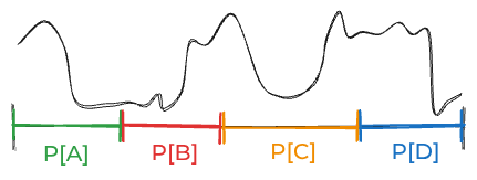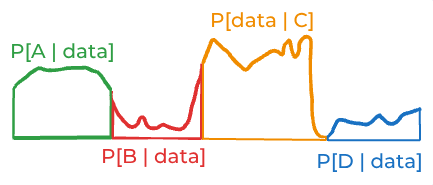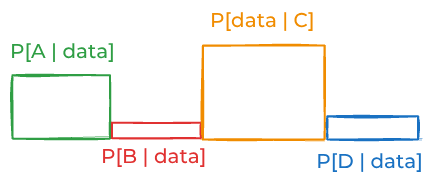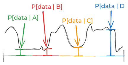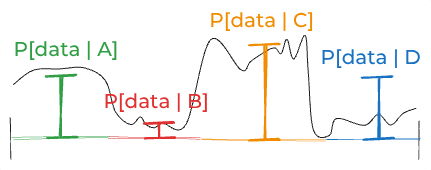 A,B,C, andD. Imagine the likelihood of the data—if you were able to think about all the infinite possibilities one by one—looked like this:This is dangerous. The problem is that you can’t actually think about all those infinite possibilities. When you think about four four discrete possibilities, you might estimate some likelihood that looks like this: