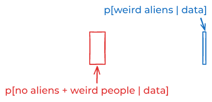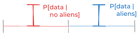 P[aliens] ≈ P[no aliens]and thatP[data | aliens] ≈ P[data | no aliens], then I must accept thatP[aliens | data] ≈ P[no aliens | data]. Maybe rejecting that conclusion just means I have some personal issues I need to work on.I deny that explanation. I deny it! Or, at least, I deny that’s it’s most helpful way to think about this situation. To see why, let’s build a second model.