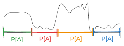 So what do we do in practice? We simplify, usually by limiting creating grouping the space of things that could be true into some small number of discrete categories. For the above curve, you might break things down into these four equally-plausible possibilities.