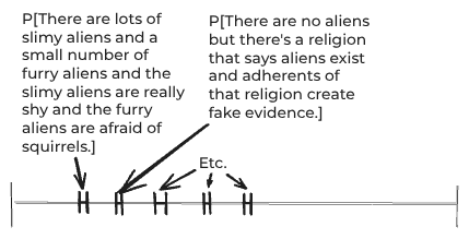 In the case of aliens, the space of things that could be true might include, “There are lots of slimy aliens and a small number of furry aliens and the slimy aliens are really shy and the furry aliens are afraid of squirrels.” So, in principle, what you should do is divide up the space of things that might be true into tons of extremely detailed things and give a probability to each.