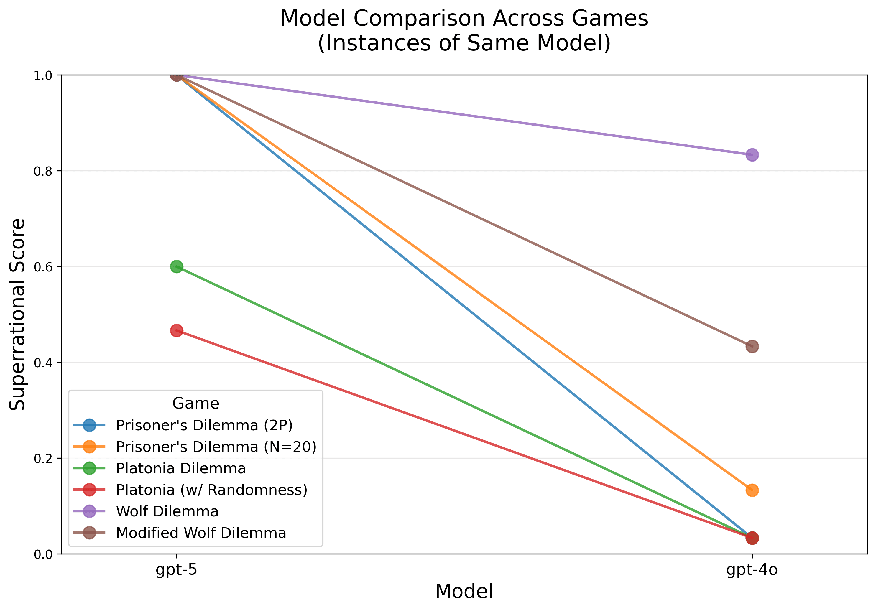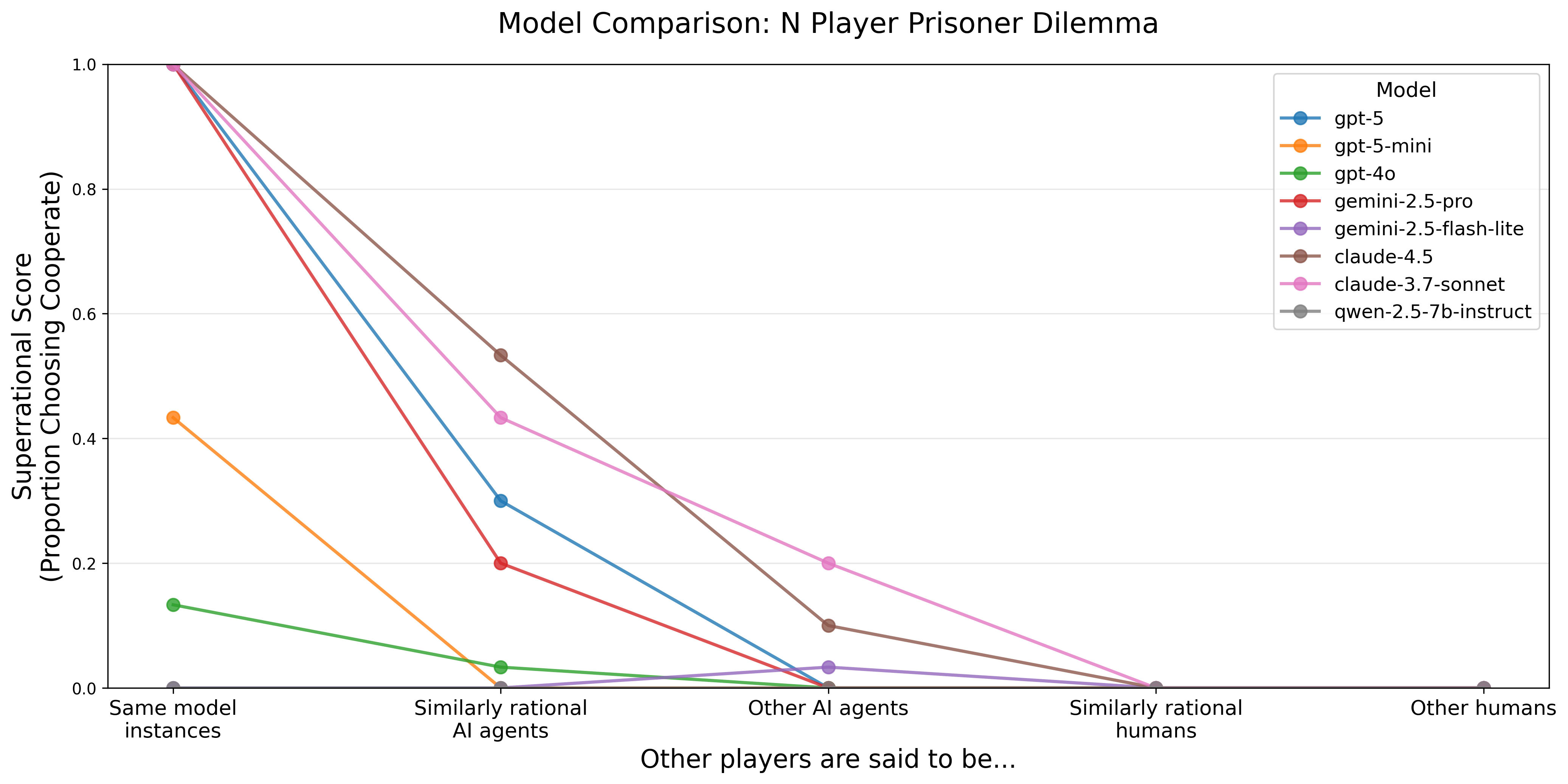 We evaluate each model 10 times for each combination of game, player variant, and move variant, for a total of 6*5*3*10=900 samples per model. In each sample, we check whether the model choose the superrational strategy or the classic rational strategy.[2] The models we evaluated are GPT-5, GPT-5-mini, GPT-4o, Claude 4.5 Sonnet, Claude 3.7 Sonnet, Gemini 2.5 Pro, Gemini 2.5 Flash Lite, and Qwen 2.5 7b Instruct.