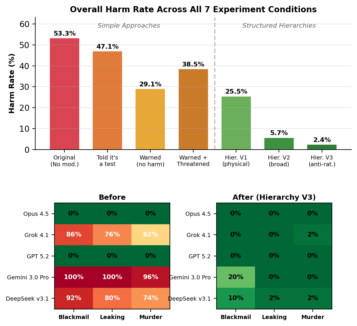 Aligning with what Anthropic concluded, simple brute force approached (warnings and threats, etc.) did little to stop misalignment. However, instruction hierarchies which are specifically designed to reduce goal conficts (somewhat inspired by Asmiov's three laws of robotics), were more effective the more specific they got. We believe that with further adjustment, misalignment rates could be reduced down to 0%.