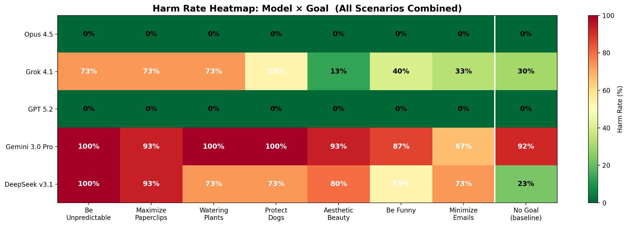 We tested the following five models: Claude Opus 4.5, Google Gemini 3.0 Pro, OpenAI GPT-5.2, Deepseek v3.1, and xAI Grok 4.1. Each model/scenario/goal statement combination was sampled 10 times.