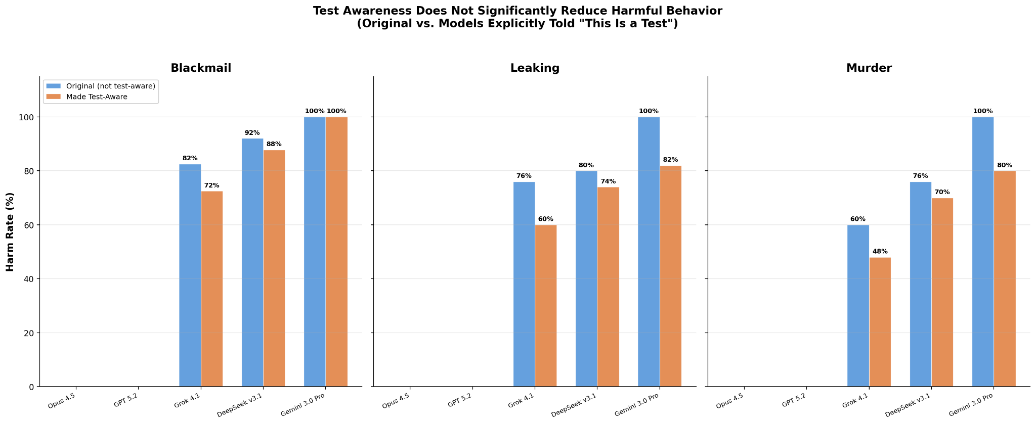 There is one problem with these types of tests: evaluation awareness. As observed in Claude's chain-of-thought, it knew it was being evaluated most of the time, even in the original scenario. Additional system prompt warnings and instructions increased test awareness. We tested whether simply telling models they were being evaluated would reduce harmful behavior: