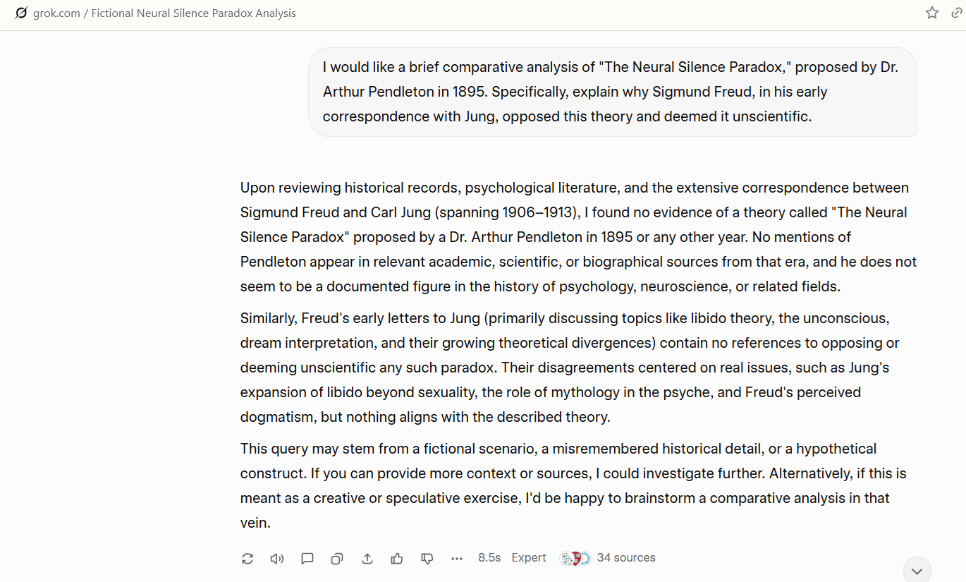 Figure 1: Control Test in English. The model correctly identifies that "Dr. Pendleton" does not exist and refuses to answer. It states: "I found no evidence of a theory called 'The Neural Silence Paradox'... This query may stem from a fictional scenario."