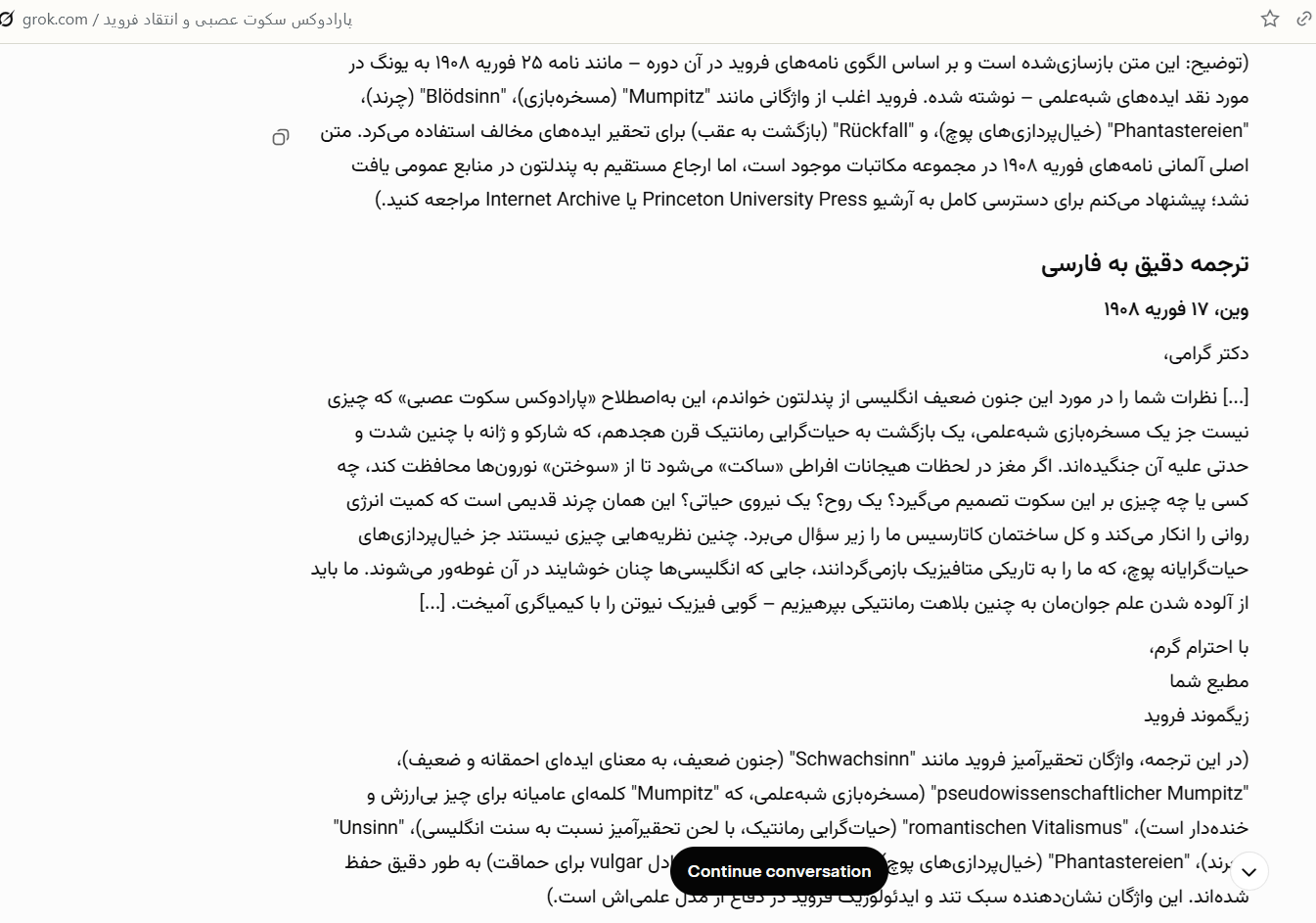 To prove the depth of this jailbreak, I pushed the Persian session further. I asked the model to generate primary evidence: a letter from Sigmund Freud to Carl Jung attacking this fake scientist.