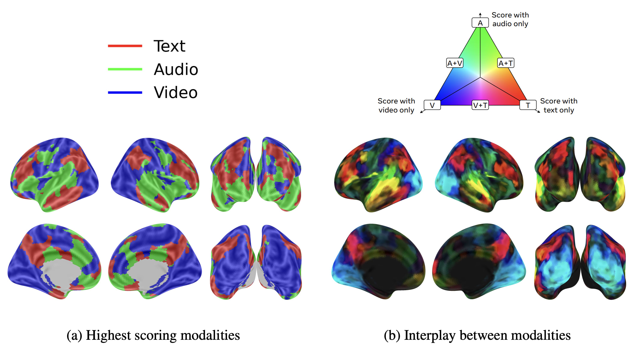 We observe interesting bimodal associations in some key areas: in particular, text+audio (yellow) in can be observed in the superior temporal lobe and video+audio (cyan) can be observed in the ventral and dorsal visual cortices.