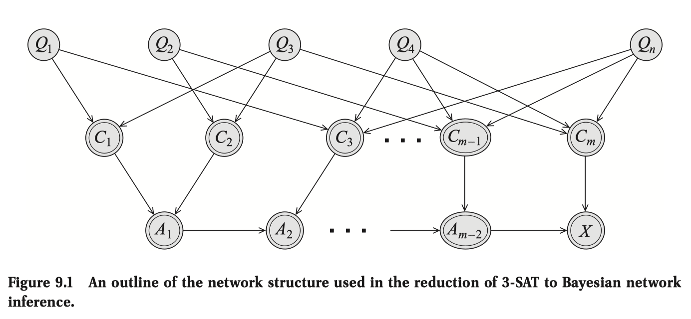 One can easily prove exact inference (decision problem of: "is ?") is NP-hard by encoding SAT-3 as a Bayes Net. Showing that it's NP is easy too.