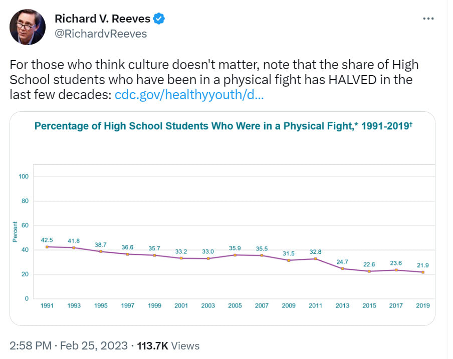 The reactionaries might say that the decline of fighting is indicative of the downfall of the masculine western man.
