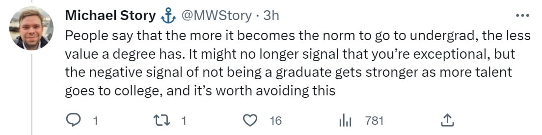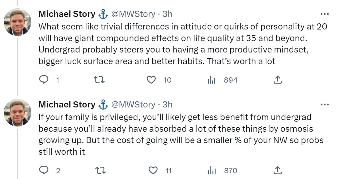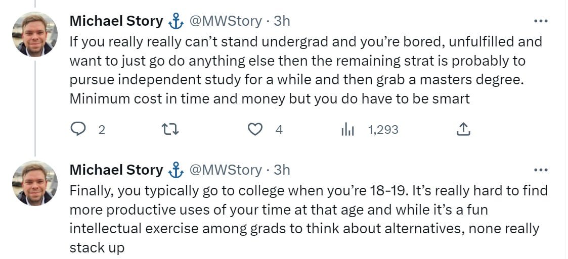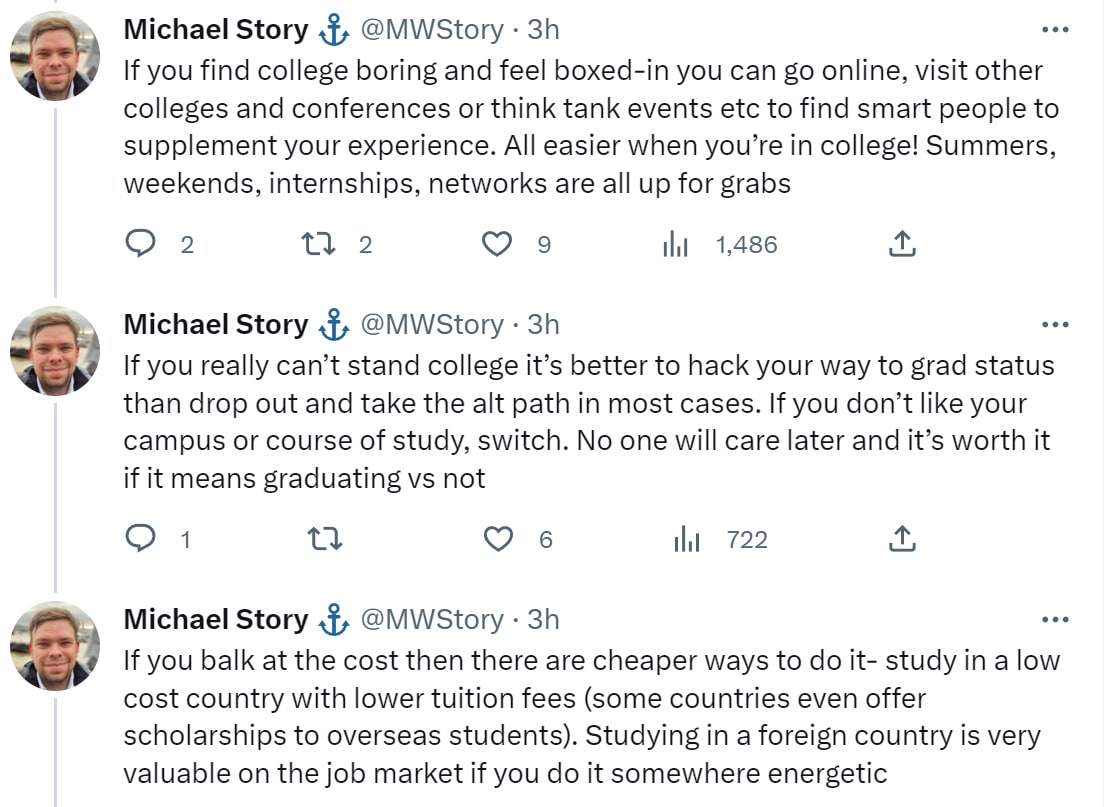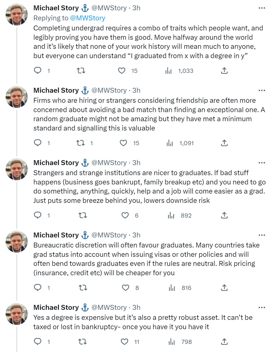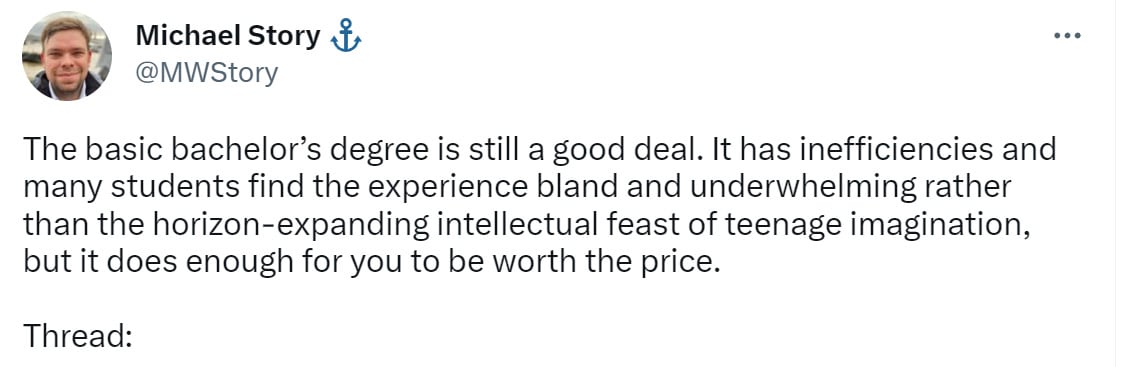 Michael Story, a very good predictor, has a Twitter thread that makes the case against college by attempting to make the case for college.