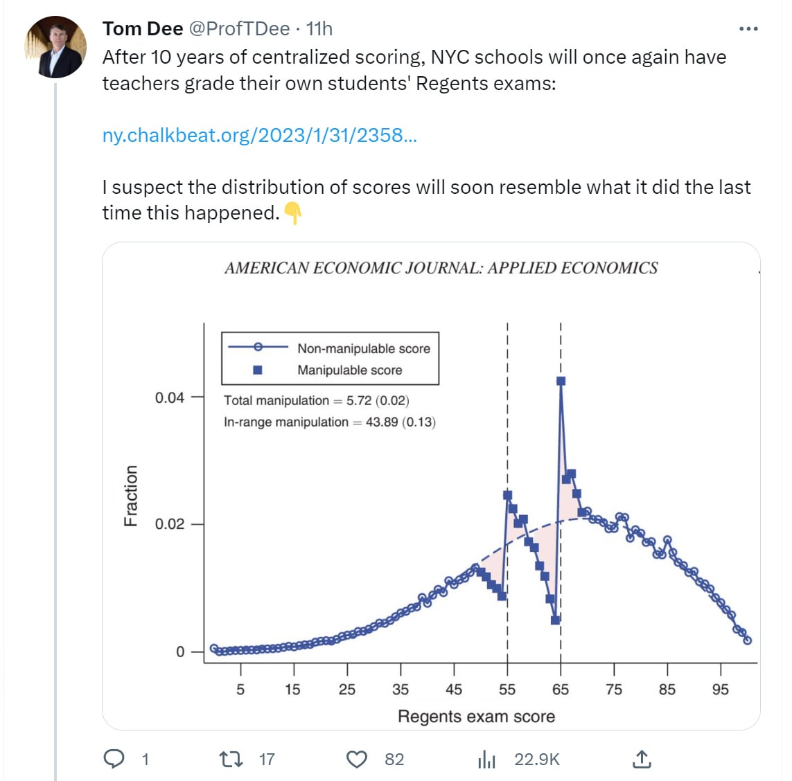 New York City schools used to let teachers grade their own students’ Regents exams. For some odd reason, they stopped. Then for some odd reason, they decided recently to resume this practice. I can’t imagine why any of that happened.