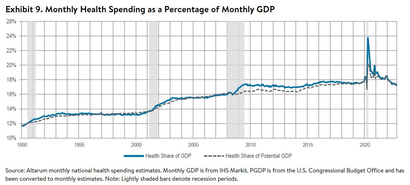 Health care spending as a percentage of GDP seems to have mostly stopped going up, once you correct for Covid you find no growth from 2016-2019 and we are now back below that level.