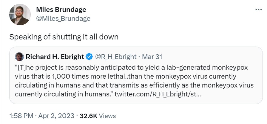 Seriously, could we not create a lab-generated monkeypox that is 1,000 times more lethal? I would really appreciate if we did not do this.