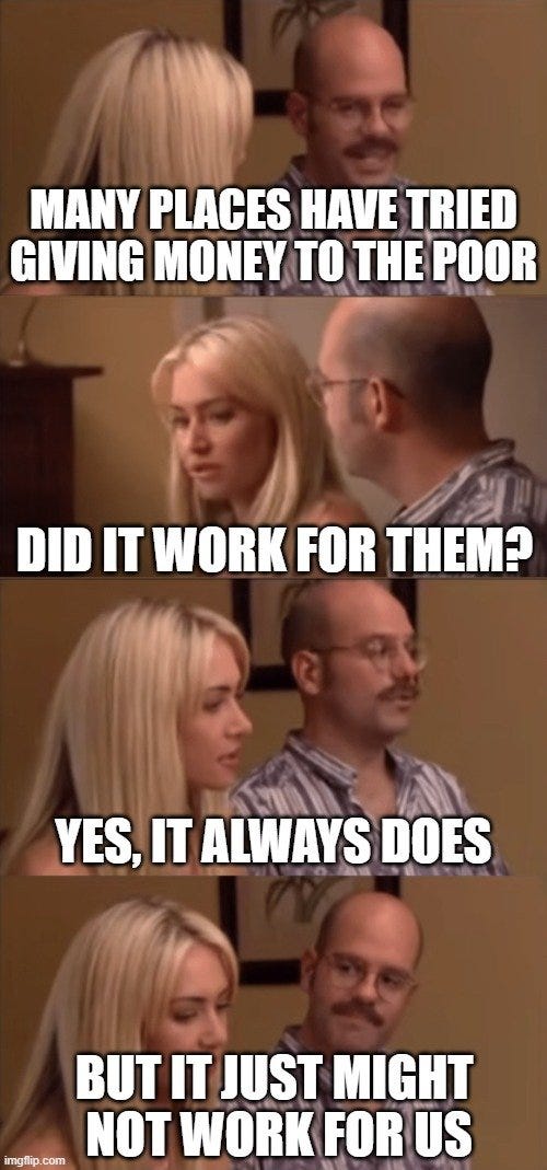 Matt Yglesias here notes that when we do give poor people money, it works for us, and also that those claiming it does not work for us and poverty has not gone down are doing so with measurements that by their very definitions exclude the money and other things we give to the poor (aka transfers) which is very much a I-don’t-know-what-the-f***-you-want-from-us vibe.