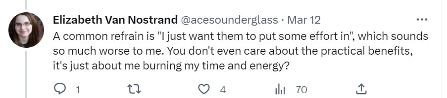 A common refrain is "I just want them to put some effort in", which sounds so much worse to me. You don't even care about the practical benefits, it's just about me burning my time and energy?