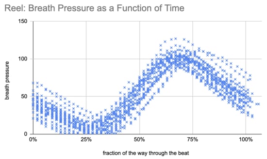 My first attempts at this sounded all wrong: it turns out I didn't actually know what pattern I was making. It was just something where I'd played around with blowing different ways until it sounded the way I wanted it. So I collected some data, tracking breath pressure as a function of how far through the beat I was: