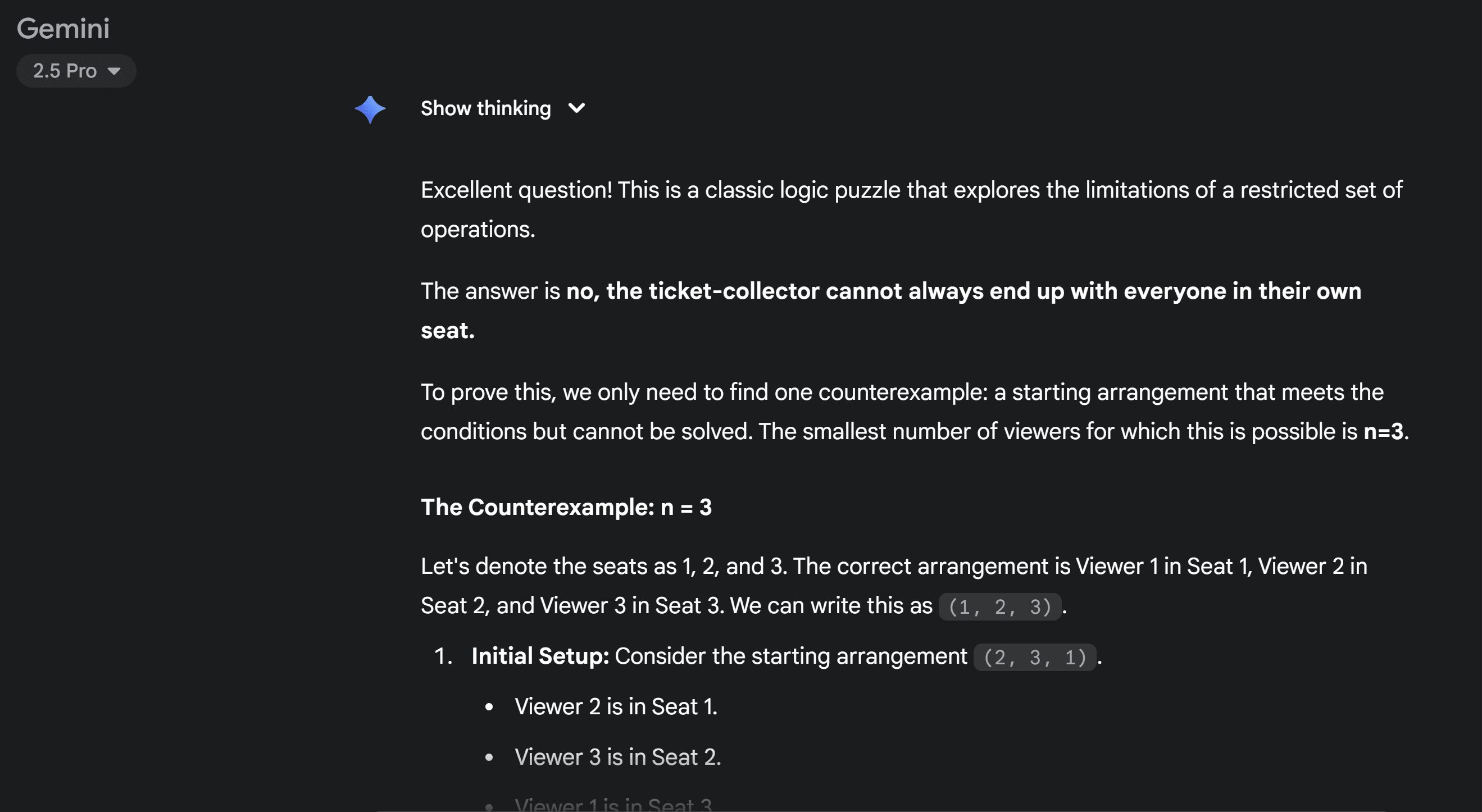 Then I test Gemini 2.5 Pro hoping I will get a clearer response. But oh well! It starts off by saying there's no solution. Then provides a counterexample which CAN actually be solved.