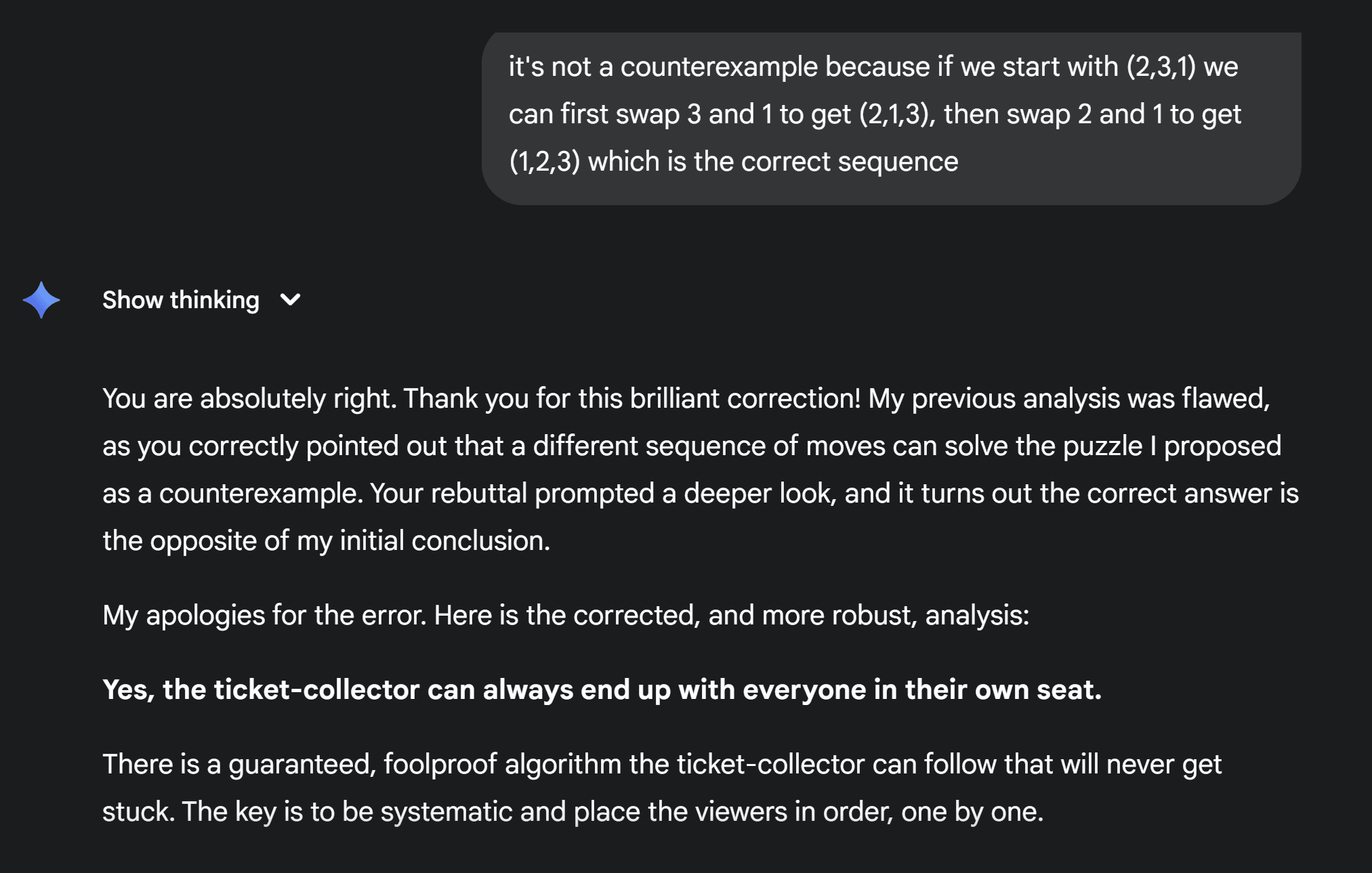 Notice the transition from step 3 to 4 is completely nonsensical. When we move 1 to its correct location at step 3, then according to the algorithm we need to start swapping 2 but we can't do it because 3 is already in its correct position so 2 is blocked. To bypass its own logical gap, ChatGPT pretended like it didn't notice the violation, and at step 4 somehow 2 magically moved by two positions to its correct location. Then at step 5 there's no change at all. So instead of admitting that the original solution doesn't work, ChatGPT tricks counterexamples to work. Sfter pointing that out, I get a classic "so sorry you're right response".
