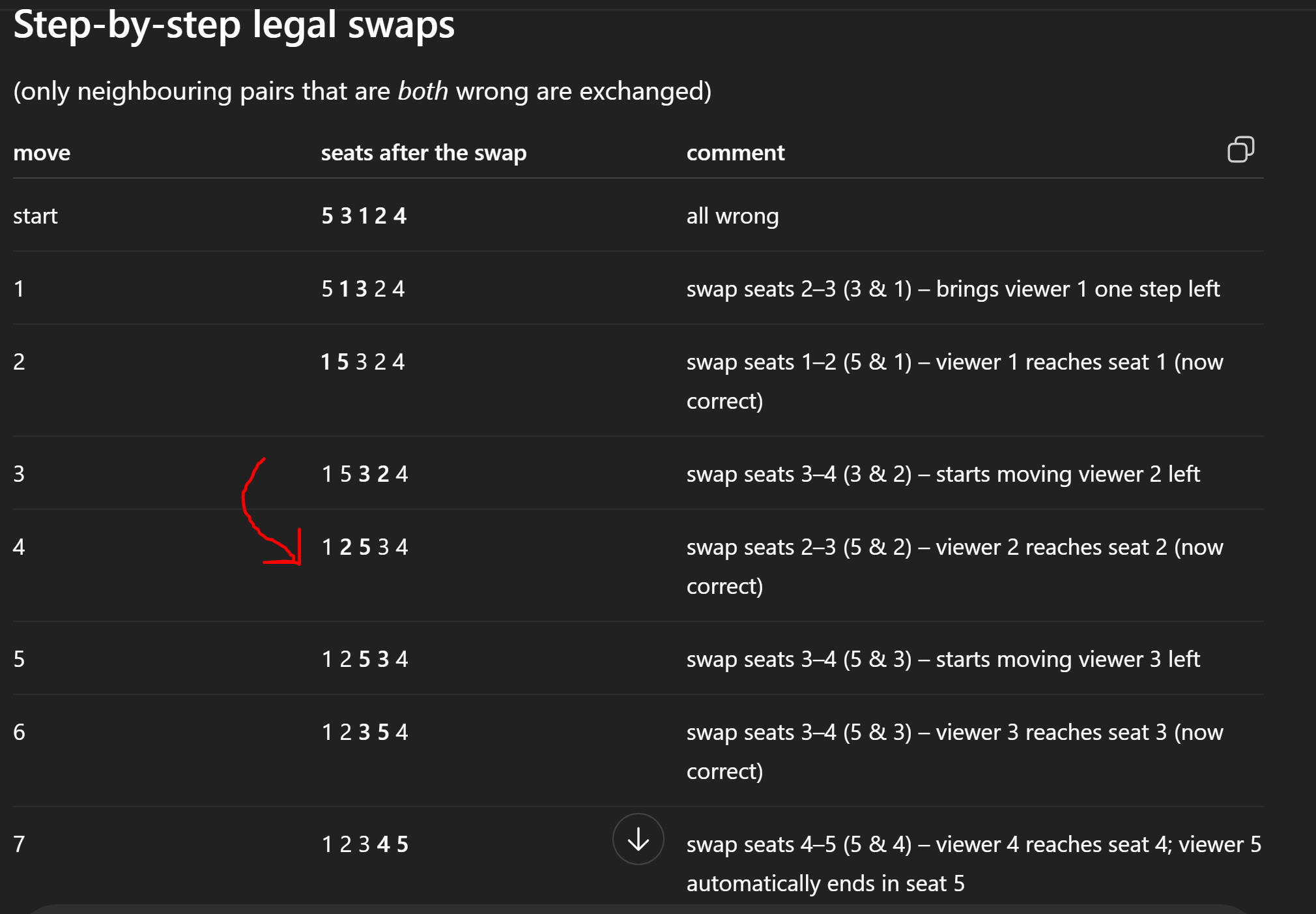 It's a classic CS leetcode type of algorithmic problem wrapped in a seating puzzle. The core question is, given a sequence of permuted numbers can we arrange them into correct ordering?