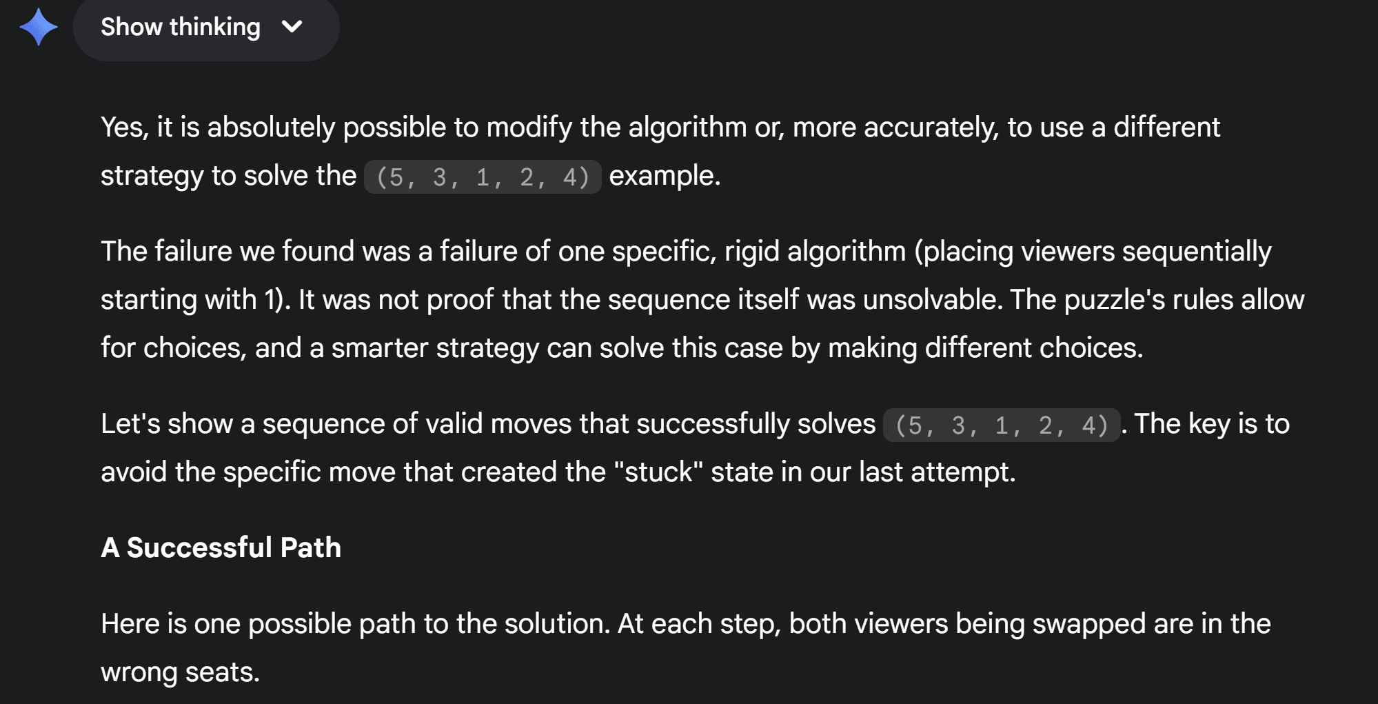 So Gemini resorted back to its original answer that the problem is not solvable. Then I asked if it's possible to modify the algorithm to solve the example, and it gave me a solution that solves the example but didn't generalize it.