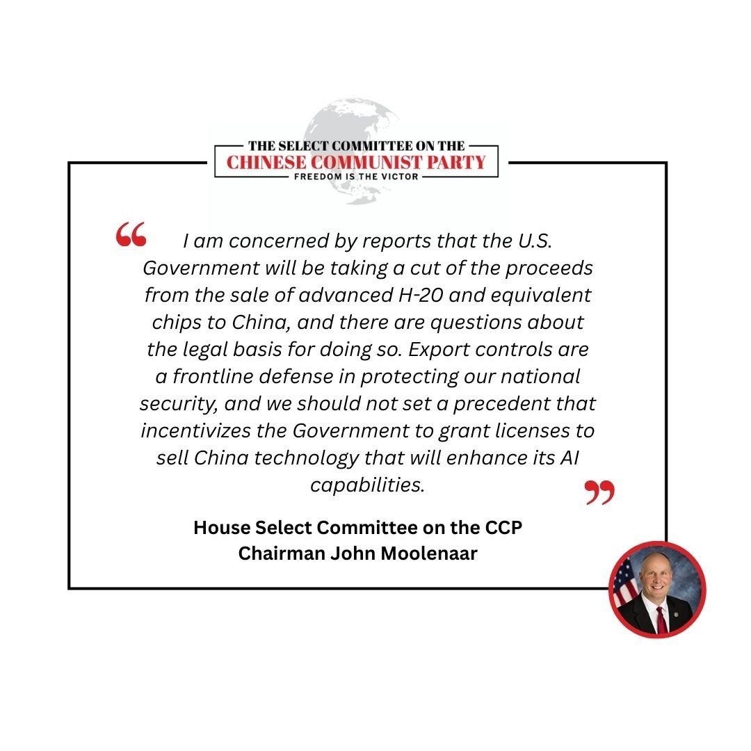 Administration sells out America, allows H20 chip sales by Nvidia and MI308-class chip sales by AMD to China. The price? In theory 15% of sales. And it looks like it’s quickly becoming too late to stop this from happening.