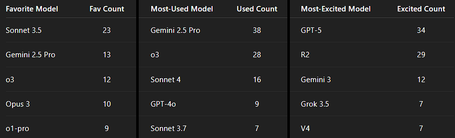 At the time of this survey in May 24 they were beloved models among some crowds, however notice that they weren’t seeing much use, also I am surprised Gemini was getting so much love and use among this crowd.