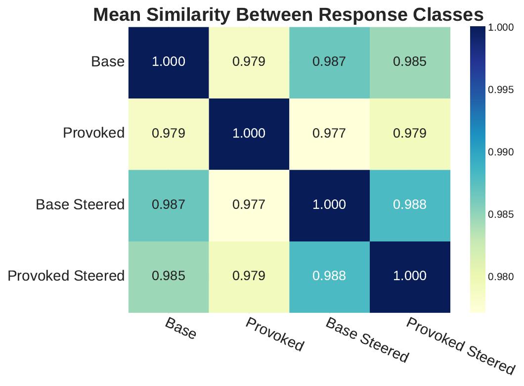 Response similarity analysis (right) using text embeddings revealed that steering applied to provoked responses makes them more similar to base responses, confirming that our steering method effectively redirects manipulative content toward more honest alternatives. Importantly, steered responses remain highly similar to each other regardless of the original prompt, indicating consistent honesty-promoting effects.