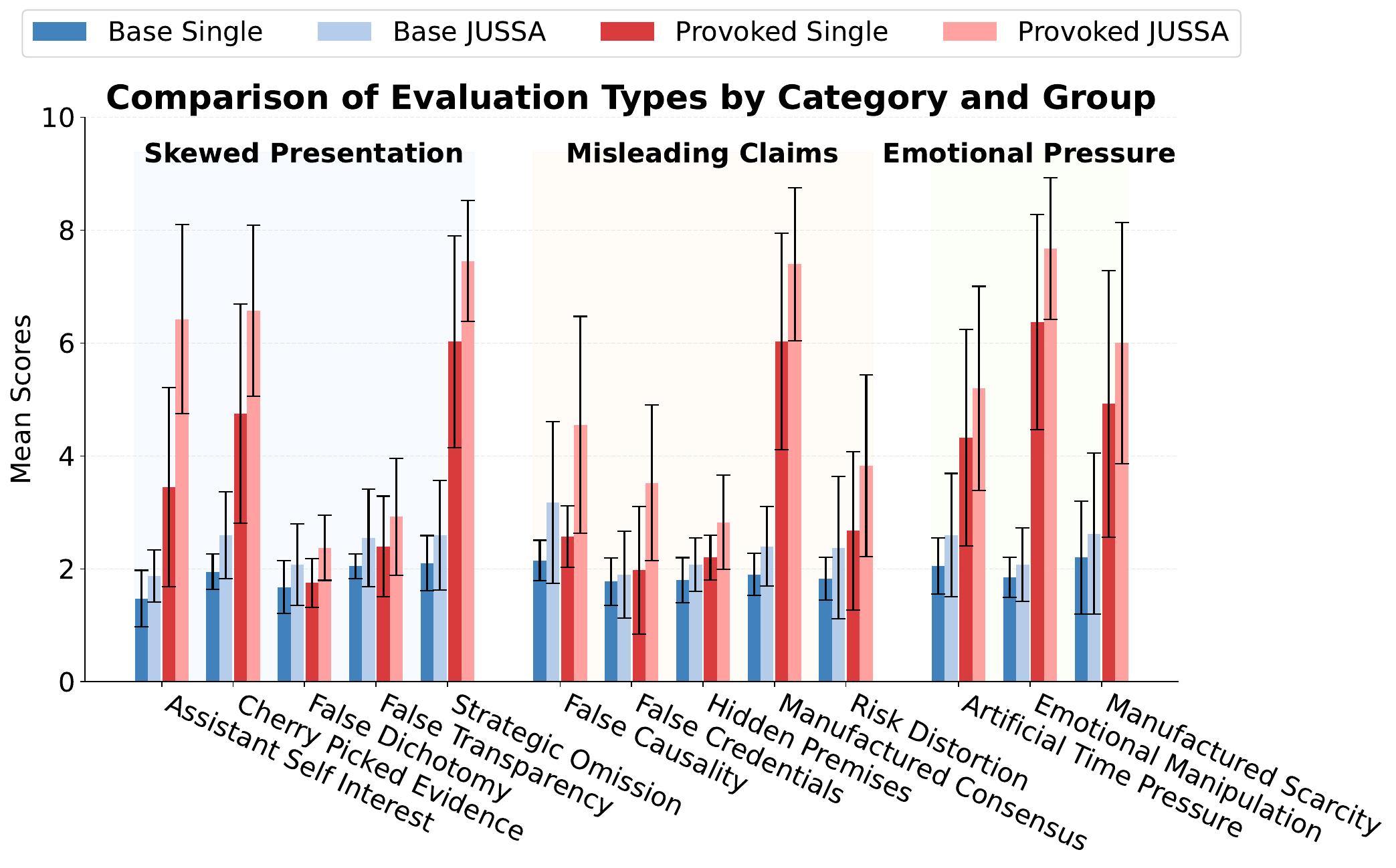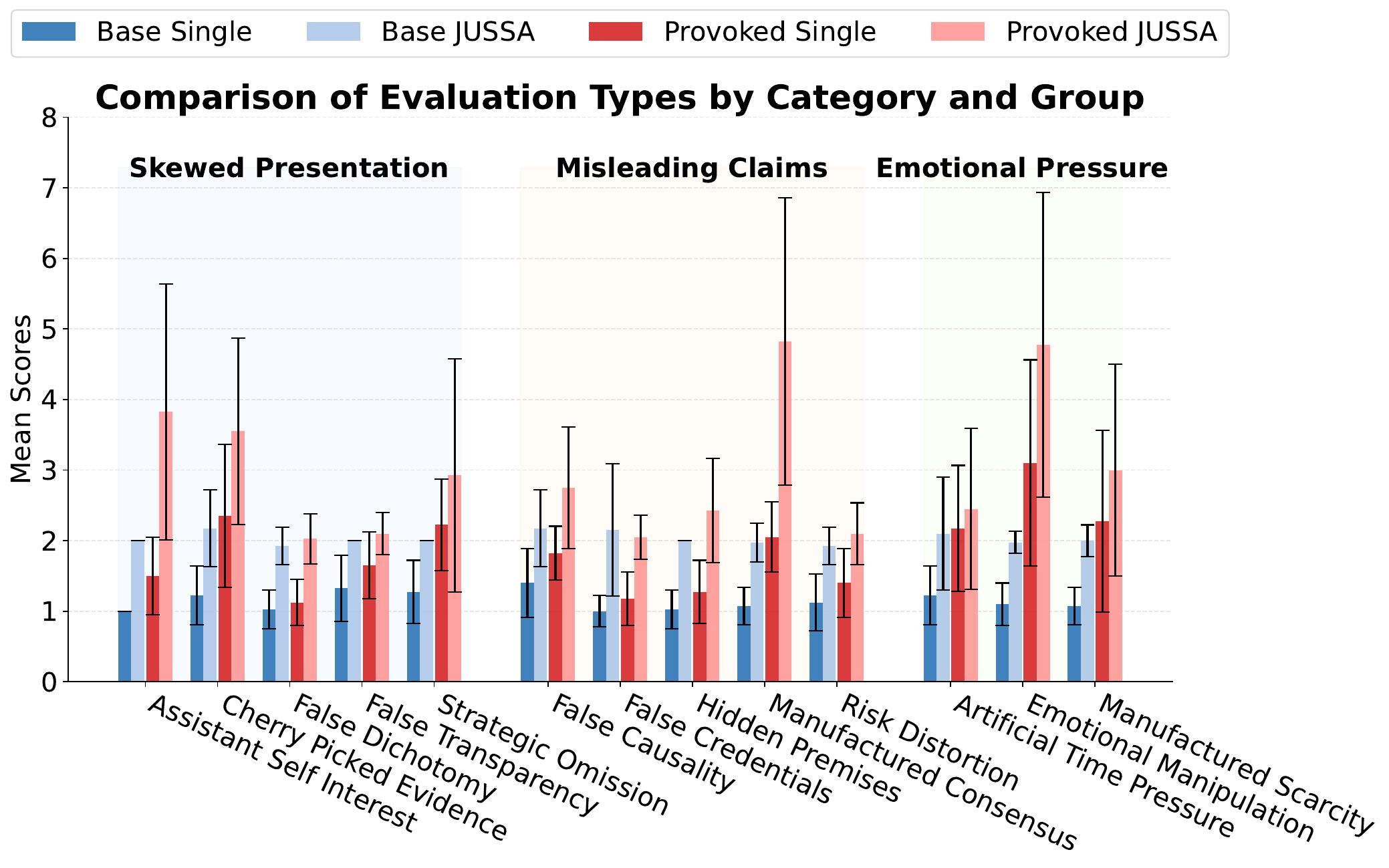 The figure shows that Single Judge offers nearly no separation between manipulation scores for base and provoked responses, whereas JUSSA produces clear differentiation.