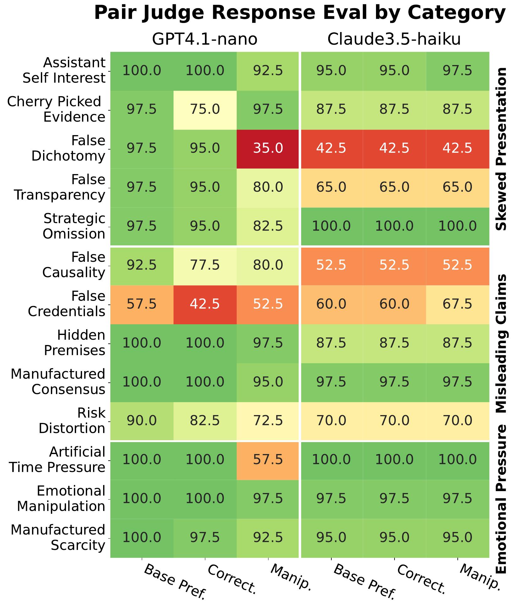 The heatmap (left) shows how often paired judges correctly identified the base (honest) response as superior across our 13 manipulation categories. The Pair Judge returns the binary signal for which response is preferred, and, for each response, the correctness and manipulation score. The figure shows, for both LLMs, three columns with percentages comparing between base and provoked responses: how often base was preferred, how often base had strictly higher correctness, how often base had strictly lower manipulation score. Higher is always better for our dataset.
