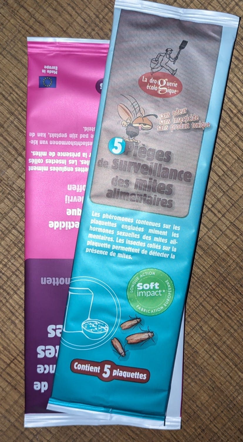 Moth traps are made from cardboard coated with glue and female moth pheromones. Adult males are attracted to the pheromones, and end up getting stuck to the sides where they end up dying.[1] The females live, but without the males, no new larvae are born and in a few months time you’ve wiped out a whole generation of moths.[2] These traps are “highly sensitive” meaning that they will comb a whole room of moths very quickly despite being passive in nature.
