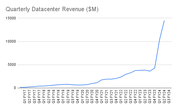 In two quarters, from Q1 FY24 to Q3 FY24, datacenter revenues went from $4.28B to $14.51B.