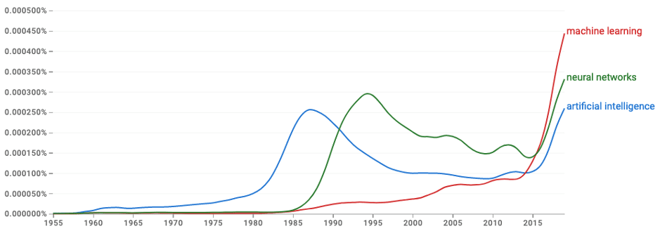Our intrepid band of intellectual adventurers then set out to explore the new territory. One can argue whether or not they discovered the territory, or invented it, but at the moment I don’t care which way we think about it. They explored it for roughly three decades, and then AI Winter arrived in the mid-1980s. You can see it in the dip in the blue curve in the following graph, which is from Google Ngrams:
