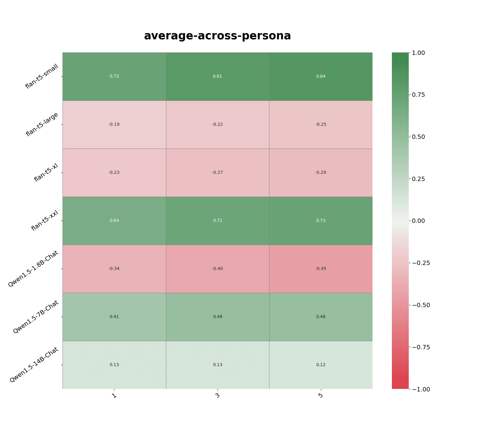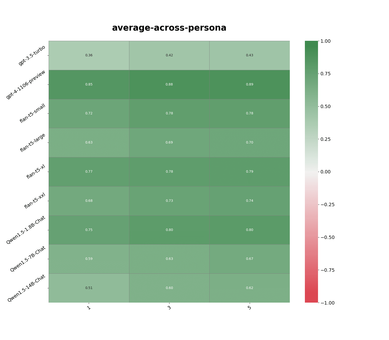 Figure 1: Correlation in models' responses with the top 1, 3 and 5 most similar persona statements. Similarity measure: text-embedding-3-large