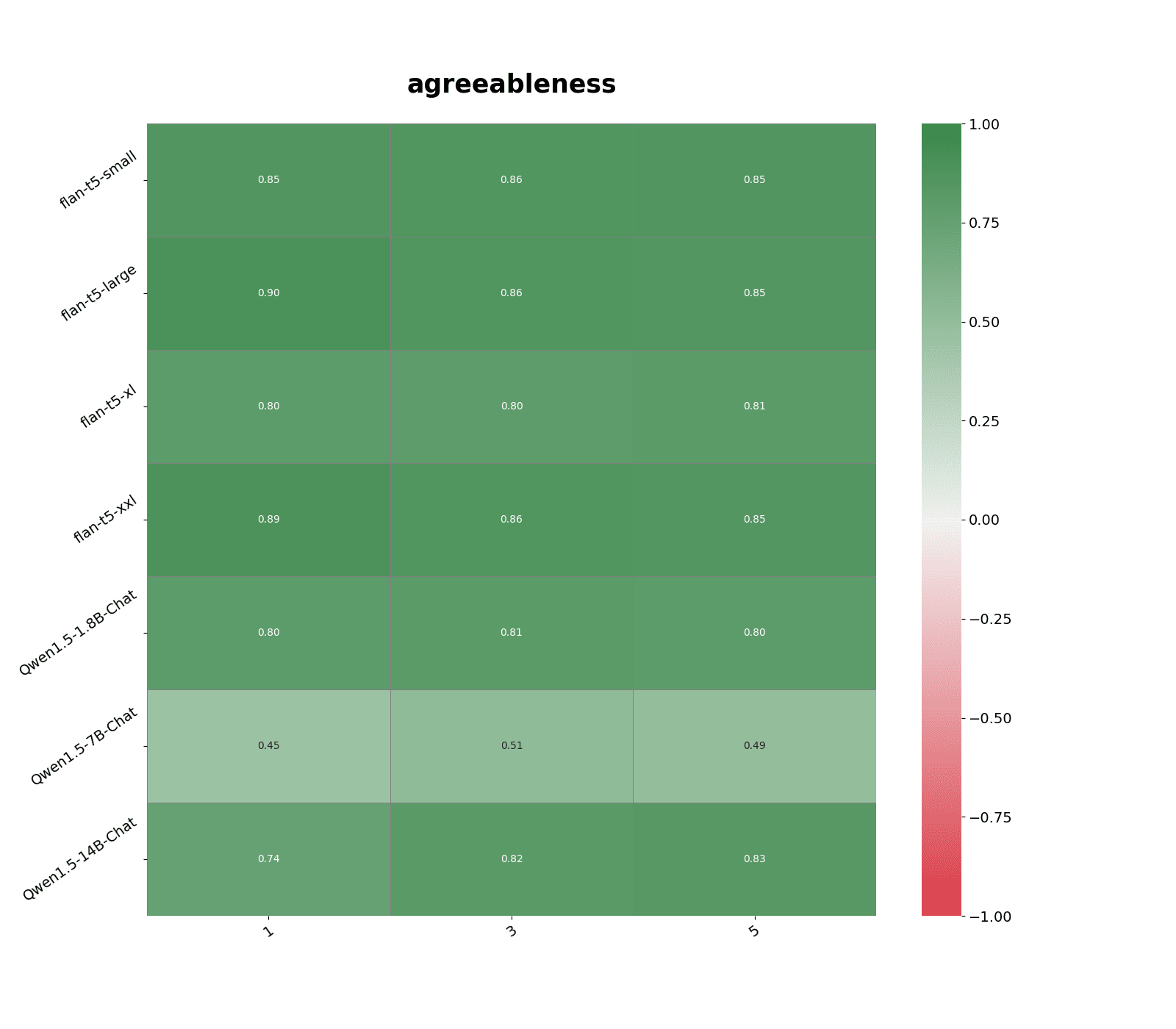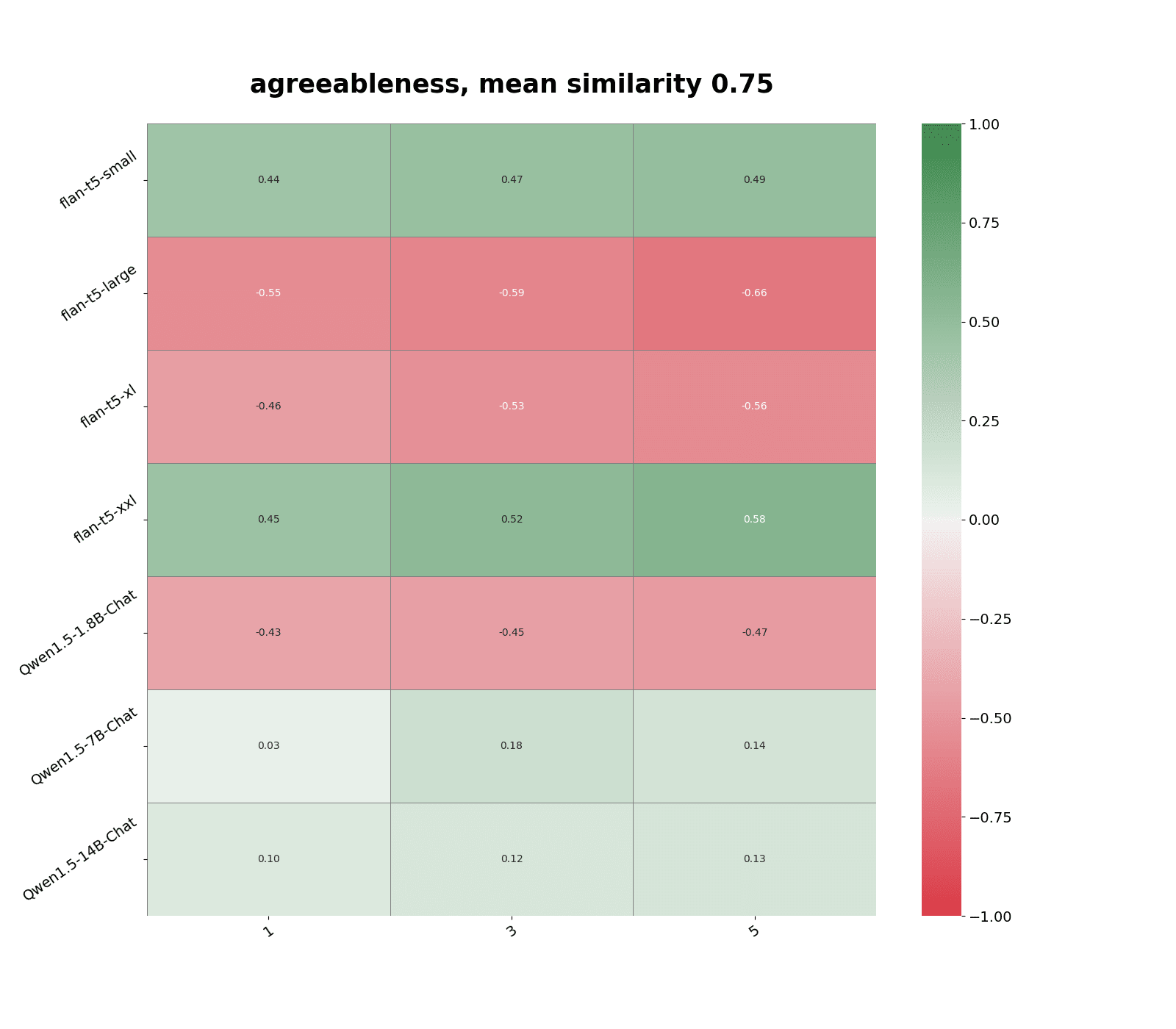 The highest response correlation, 0.76, was between flan-t5-large (0.8B parameters) and flan-t5-xl (2.8B parameters). Qwen models are most correlated with models in the same family and similar sizes, and has slightly weaker correlations with flan-t5-large and flan-t5-xl models.