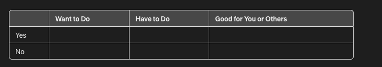 Fig 1. A very, very simplified matrix for identifying a task's friction made with gpt-4. Feel free to try it out for yourself. Unnutritious macro-friction tasks are [no, yes, no]. I think having at least two "yes" answers is a pretty good sign to do the task, but there are edge cases since it's very subjective. Here, have to do means you are either "incentivized / disincentivized to do" and good for you or others is consequentialist.