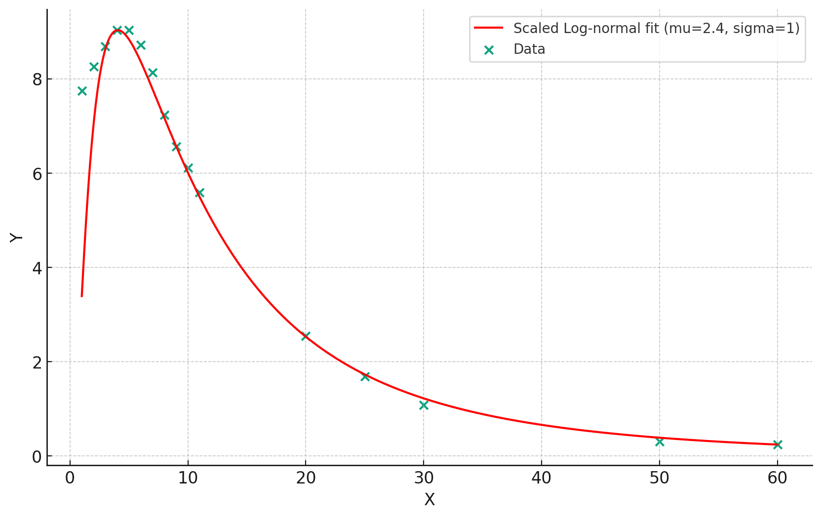 Metaculus doesn't have a way to draw samples from distributions, so I messily approximated the function by finding the PDF at various points and playing with a lognormal distribution until it looked roughly right. The median of the distribution is 2034. I fit a lognormal distribution this Metaculus question, discarding years before 2023. This is what the distribution looks like: