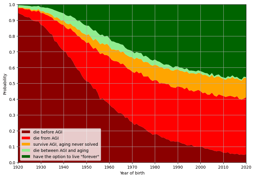 As is expected, the earlier people are born, the likelier it is that they will die before AGI. The later someone is born, the likelier it is that they will either die from AGI or have the option to live for a very long time due to AGI-enabled advances in medicine.