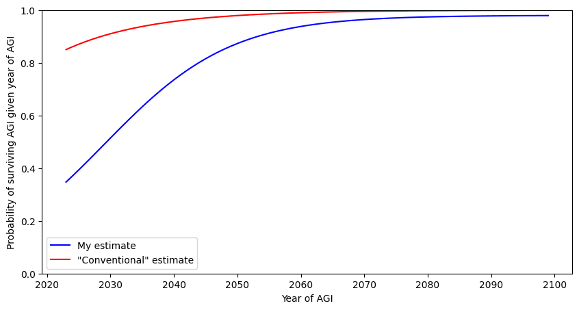 For the conventional estimate, I simply have an exponentially decaying probability of not surviving which starts at 15% given AGI in 2023 and drops to 1% by 2060.