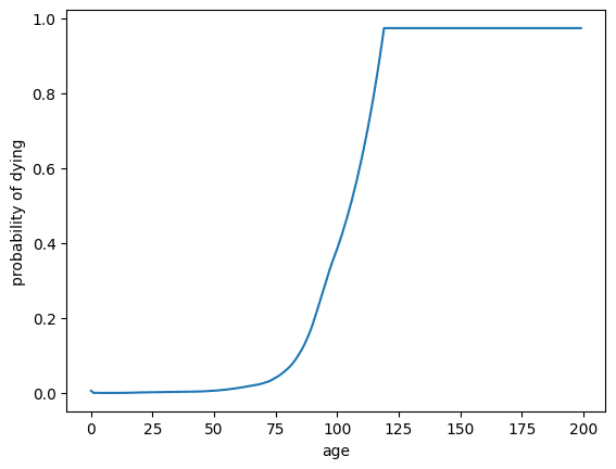 I think this is probably roughly correct, as we’re likely to see advances in medicine before AGI, but nuclear and biorisk roughly counteract that (one could model how these interact, but I didn’t want to add more complexity to the model). I use the US actuarial life table for men (which is very similar to the one for women) to determine the probability of dying at any particular age. For ages after 120 (which is as far as the table goes), I simply repeat the probability of dying at age 120, which is 97.3%. This is wrong but I expect the final estimates to mostly be correct for people born after 1940.