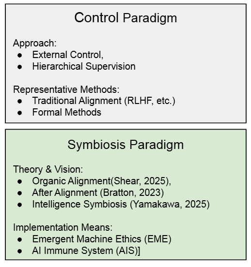 Figure 1 contrasts both paradigms. The Control Paradigm’s greatest challenge is ”continuation of control,” while the Symbiosis Paradigm’s is ”whether superintelligence possesses co-creative ethics.” The Symbiosis Paradigm consists of three layers: theoretical foundation (Organic/After Alignment), vision (Intelligence Symbiosis), and implementation means (EME, AIS).