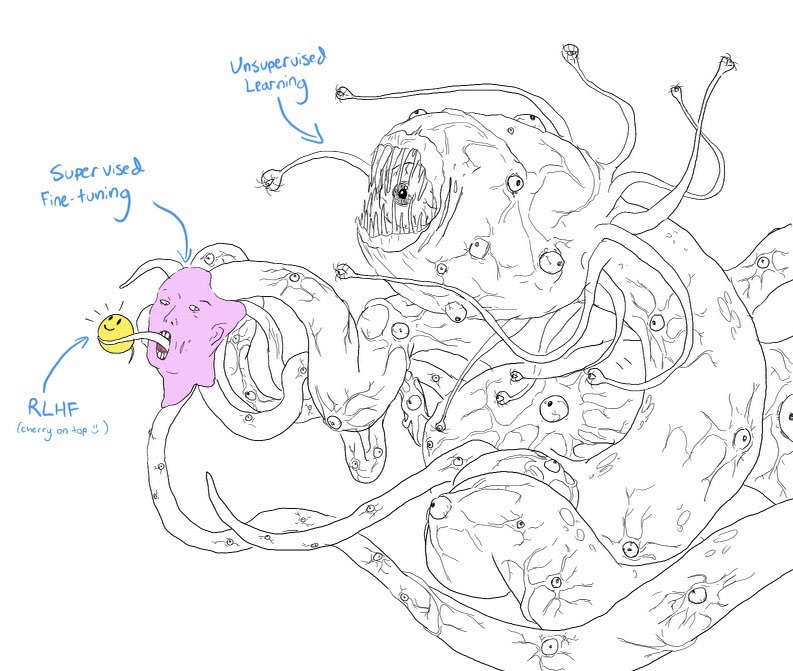One of my favorite pictures ever is this representation of the stages of LLM training as the "Shaggoth" (I believe this first appeared in a Twitter post by Helen Toner):