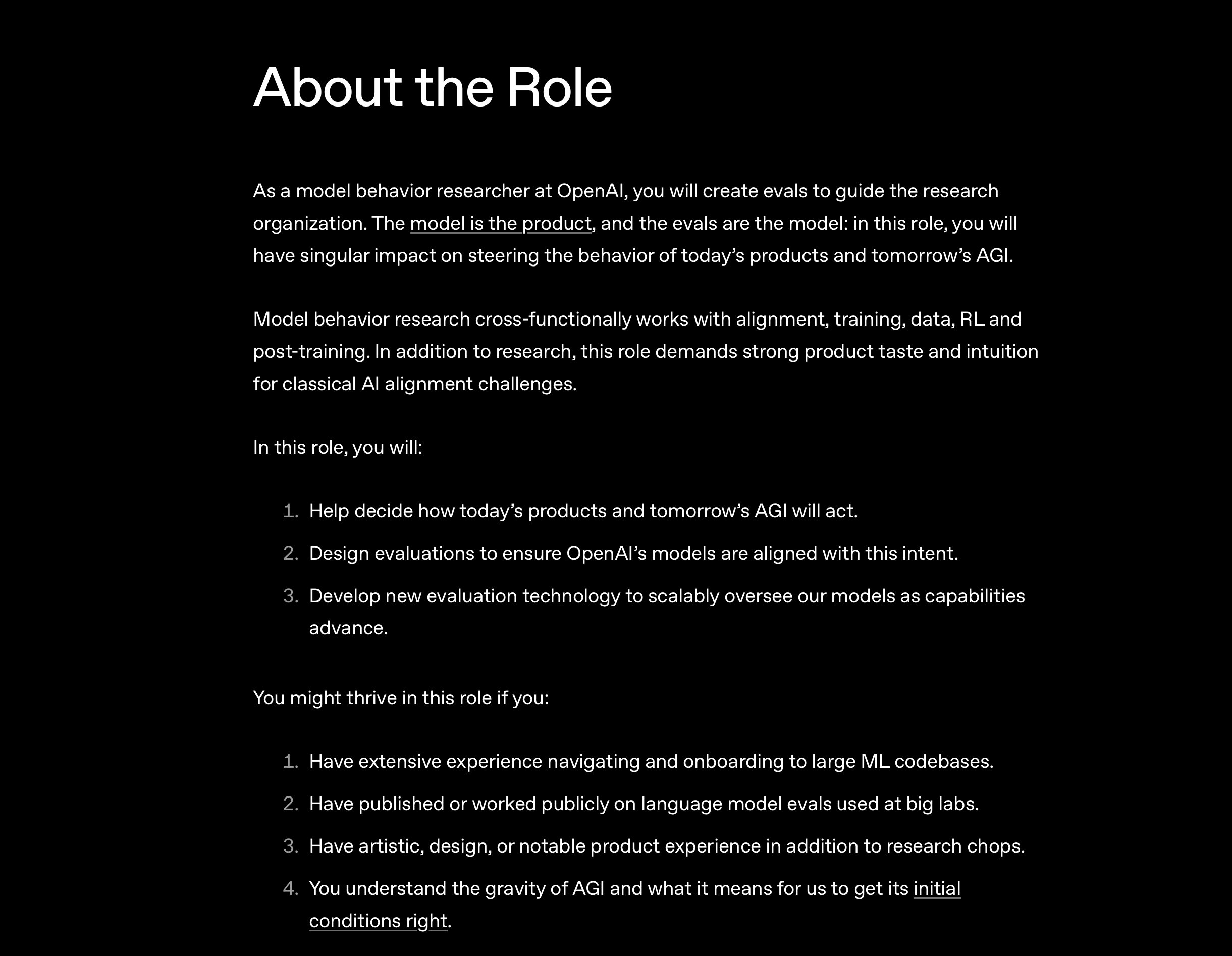 The latest recruitment ad from Aiden McLaughlin tells a lot about OpenAI's internal views on model training:
