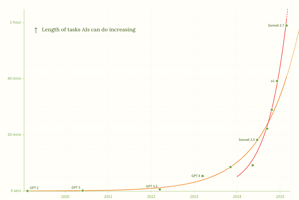 The new Moore's Law for AI Agents (aka More's Law) has accelerated at around the time people in research roles started to talk a lot more about getting value from AI coding assistants. AI accelerating AI research seems like the obvious interpretation, and if true, the new exponential is here to stay. This gets us to 8 hour AIs in ~March 2026, and 1 month AIs around mid 2027.[1]