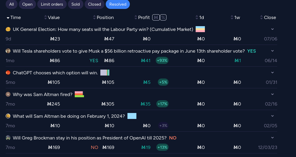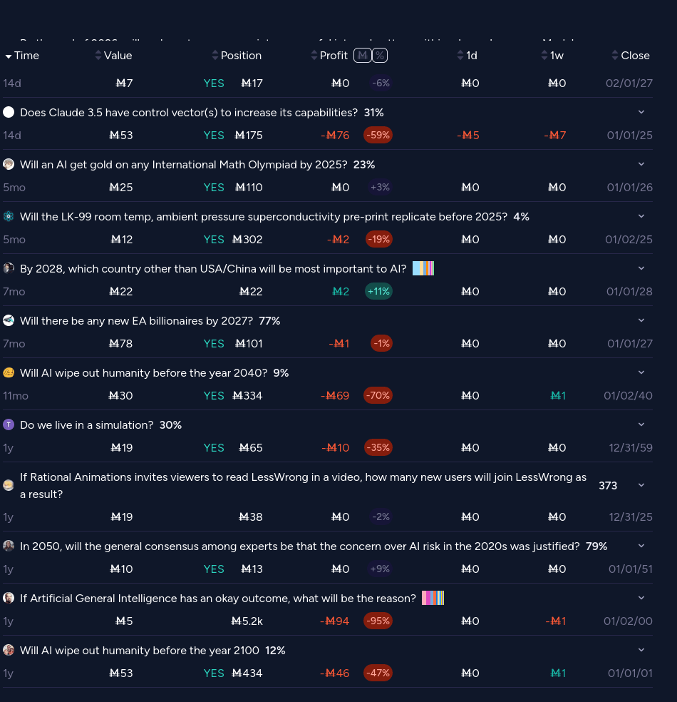 The vast majority of my losses are on things that don't resolve soon and are widely thought to be unlikely (plus a few tiny not particularly well thought out bets like dropping M15 on LK-99), and I'm for sure losing points there. but my actual track record cached out in resolutions tells a very different story.
