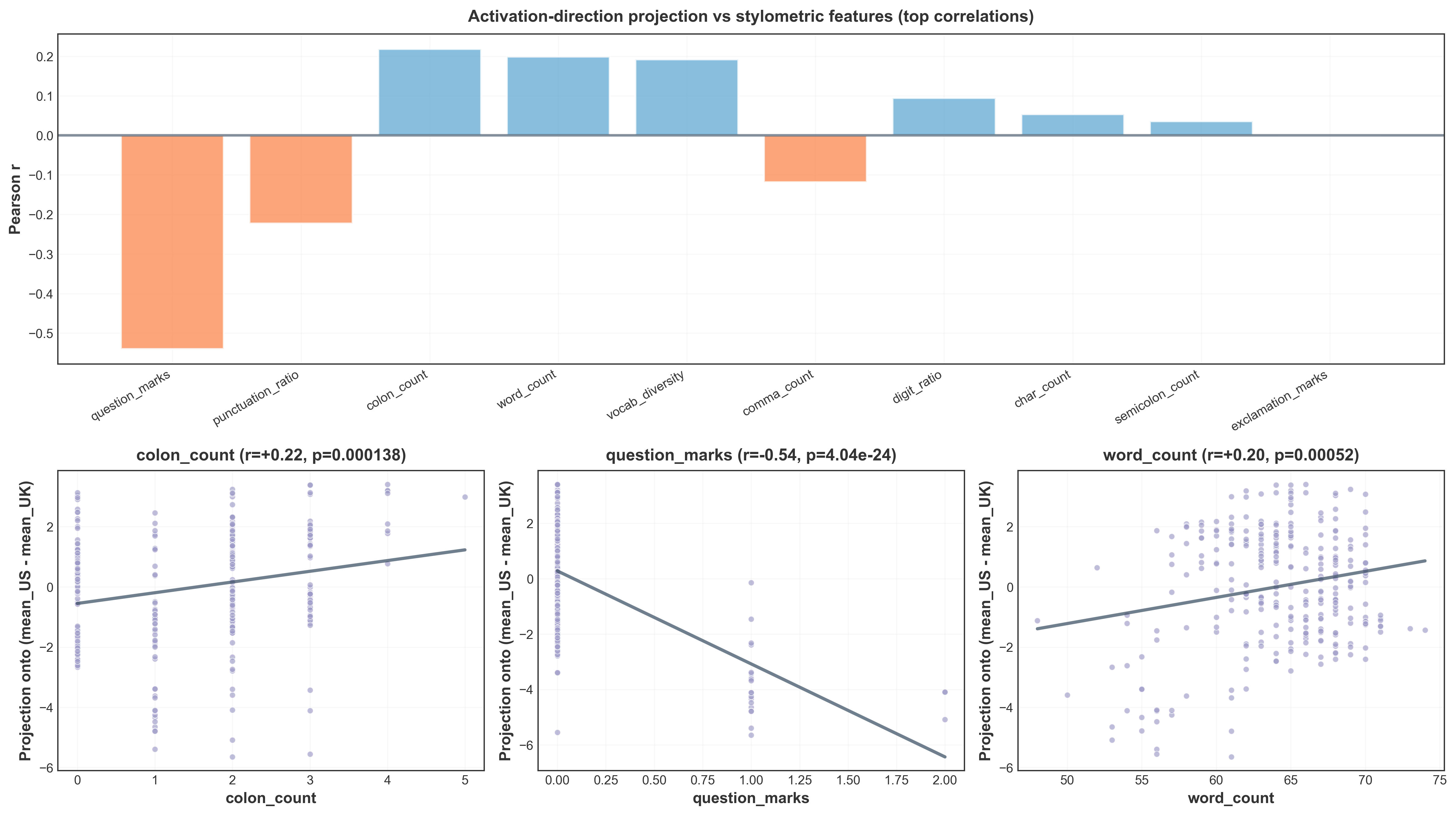 We pooled completion-token activations at layer 18 over 30 prompts × 5 completions per prompt per model (n=300 total). For each completion we computed its projection onto the mean-difference direction Δ=μUS−μUK, then correlated projection scores with stylometric features extracted from the completion text.