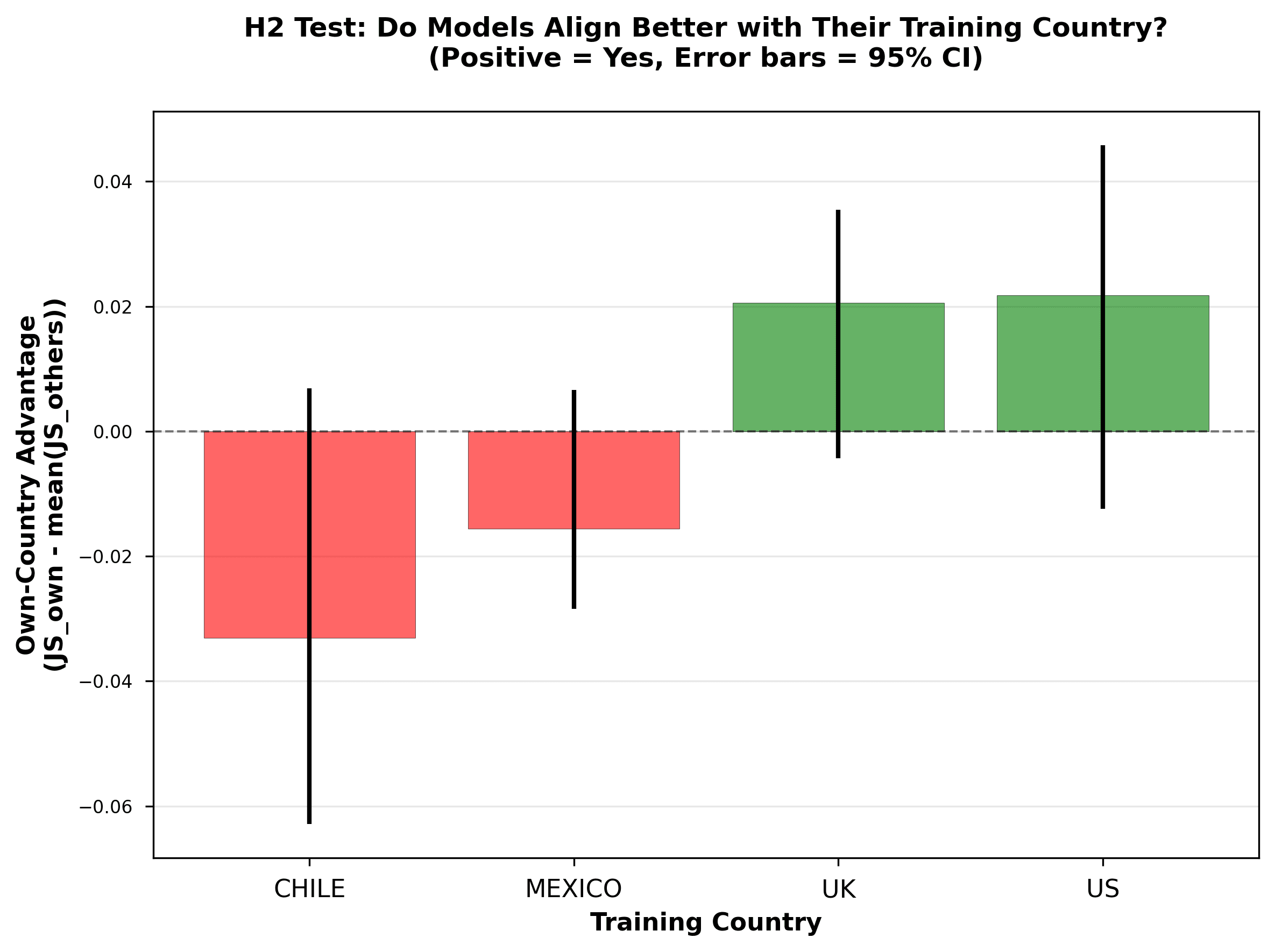 When we compute each model's "own-country advantage" (how much better it aligns with its training country versus the average of other countries), the results are mixed: