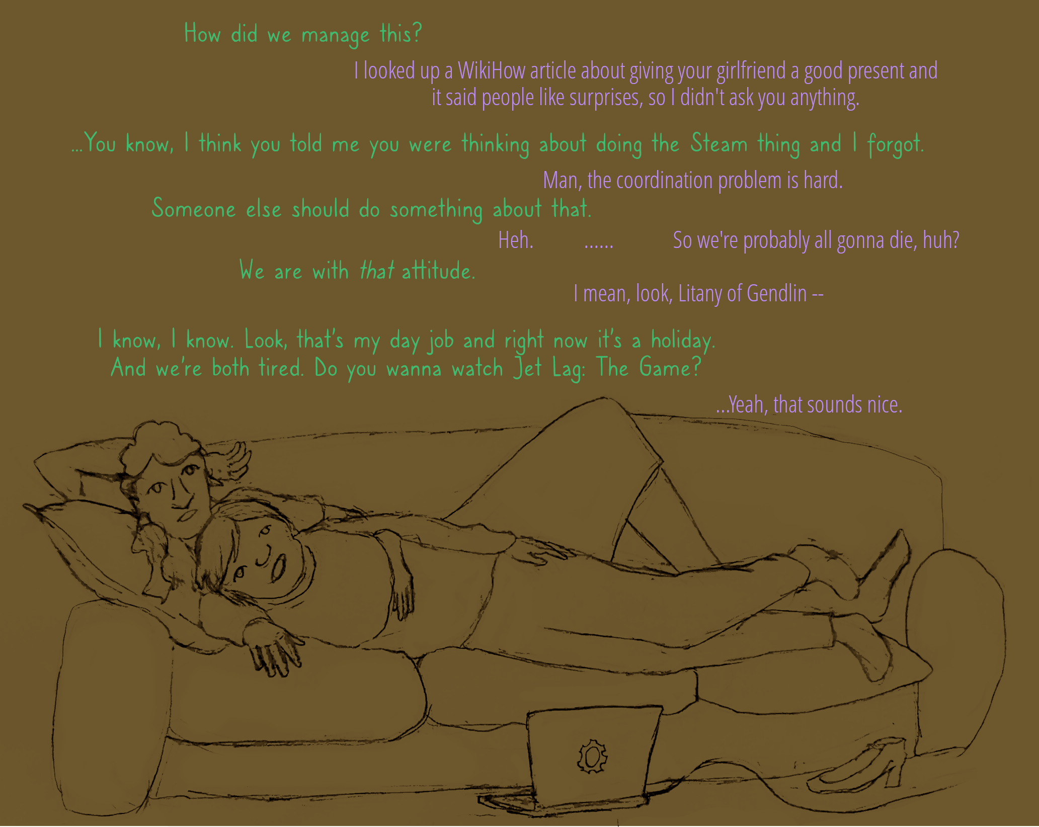 The art too. /chefs kiss🤌/. There's something beautiful about the subtle lineart of interaction behind the text, the cup passing hands and their true-to-character sitting postures. I didn't notice it consciously on the first read through, just felt its seamless effect. Brilliant how it all slowly goes dark, til the sun rises in the end—mirroring the solstice I imagine they met to celebrate.