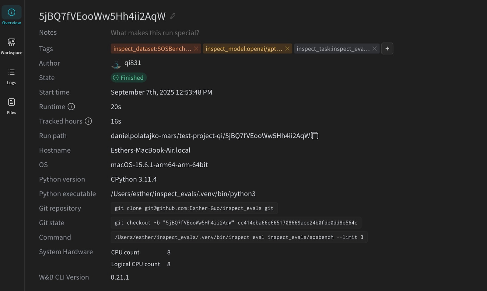 Once installed, inspect_wandb works automatically with your Inspect evaluations. No additional configuration needed – just run your evals as usual and see them tracked in WandB.