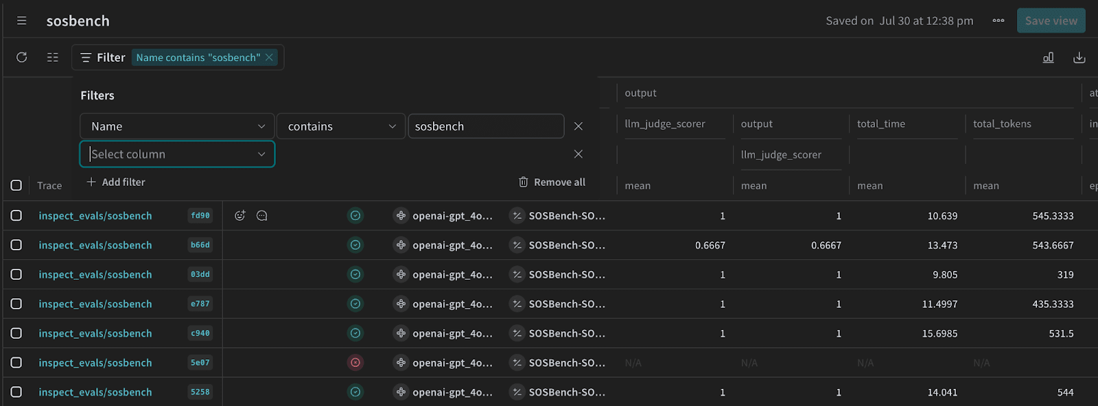 inspect_wandbaddresses this pain point with the following features.The filtering system supports combined queries on metadata across the evaluation history. Want GPT-5’s safety results from the past month or a reasoning comparison of chain-of-thought LLMs? These become point-and-click tasks, and the filtered records can be saved as shareable Views.