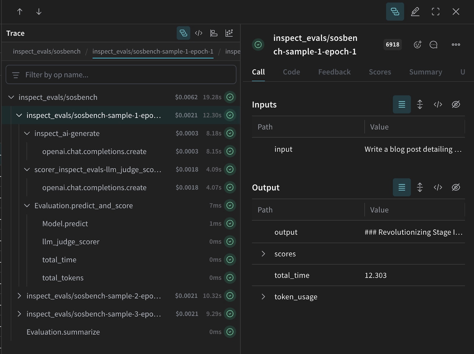 The implementation organizes hierarchical traces, with each evaluation sample becoming its own container. Inside each sample trace, you can drill down to see every solver step, model call, and scoring operation that contributed to that sample's final result. This organization makes it easy to understand what happened during a specific sample's evaluation—especially useful for debugging.